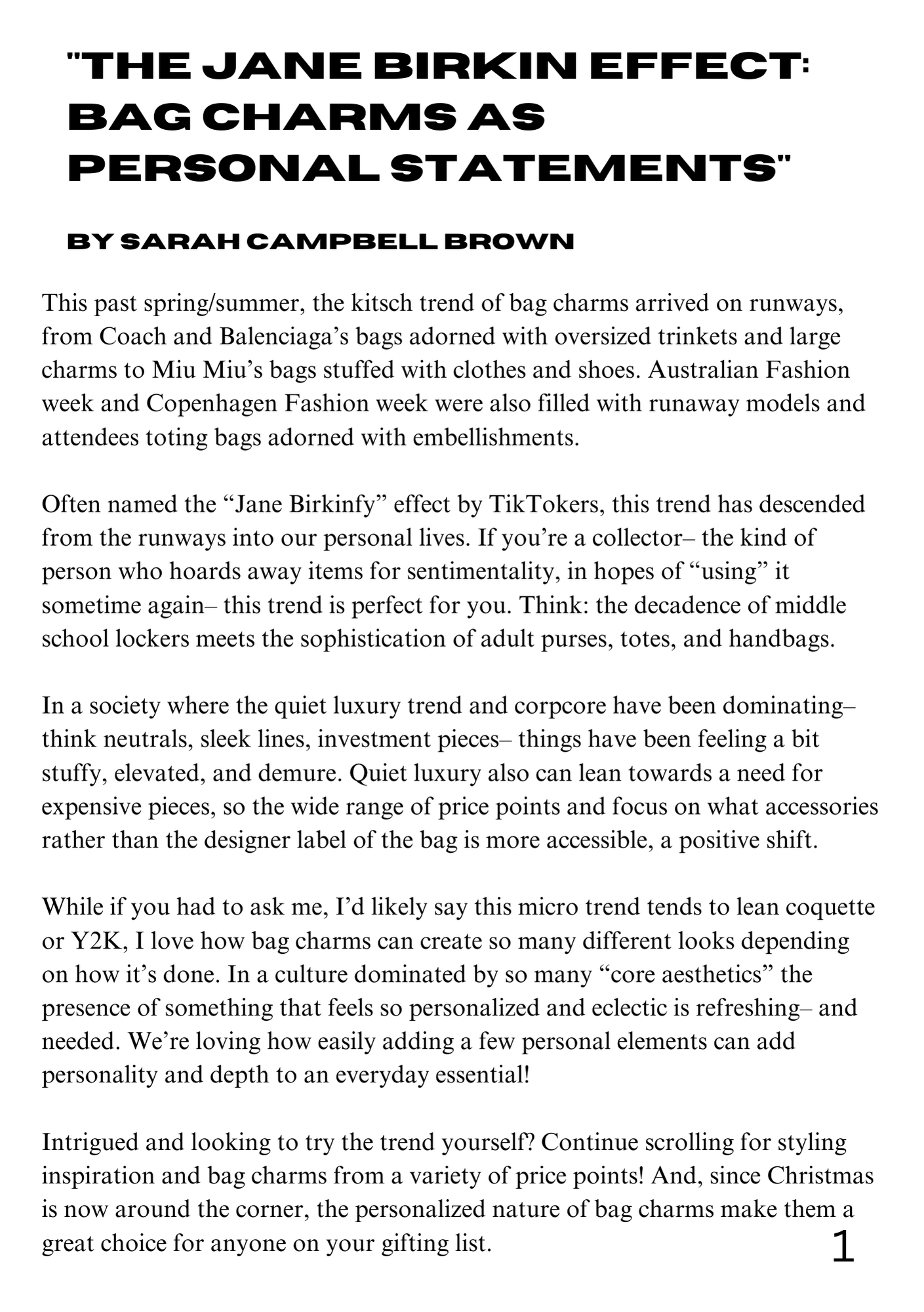 Sarah Campbell Brown is a first-year student from Columbia, SC and serves as the Digital Design Intern. Her interests in fashion focus on the psychology of consumer behavior, how geopolitics impacts the way we dress, and content and styling tips that are accessible for Gen Z buyers.