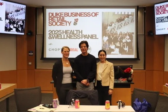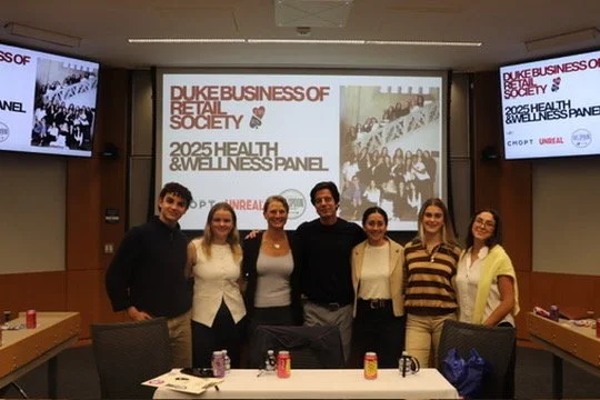 The Health & Wellness Panel, the second event in the Industry Insights Series, brought together leaders from the food and beverage space to discuss innovation, brand building, and the future of wellness. The panel featured Colin McCabe, Co-Founder of Chopt; Sophia Sesto, Vice President of Culture & Brand at Poppi; and Sophie Dehrey, Senior Director of Brand Innovation at Unreal Snacks, who shared insights on redefining healthy eating, building authentic consumer connections, and scaling purpose-driven brands. Moderated by Megan Overbay, Co-Founder and COO of Big Spoon Roasters and Duke alumna, the conversation offered candid perspectives on entrepreneurship, brand strategy, and leadership, followed by an engaging audience Q&A.